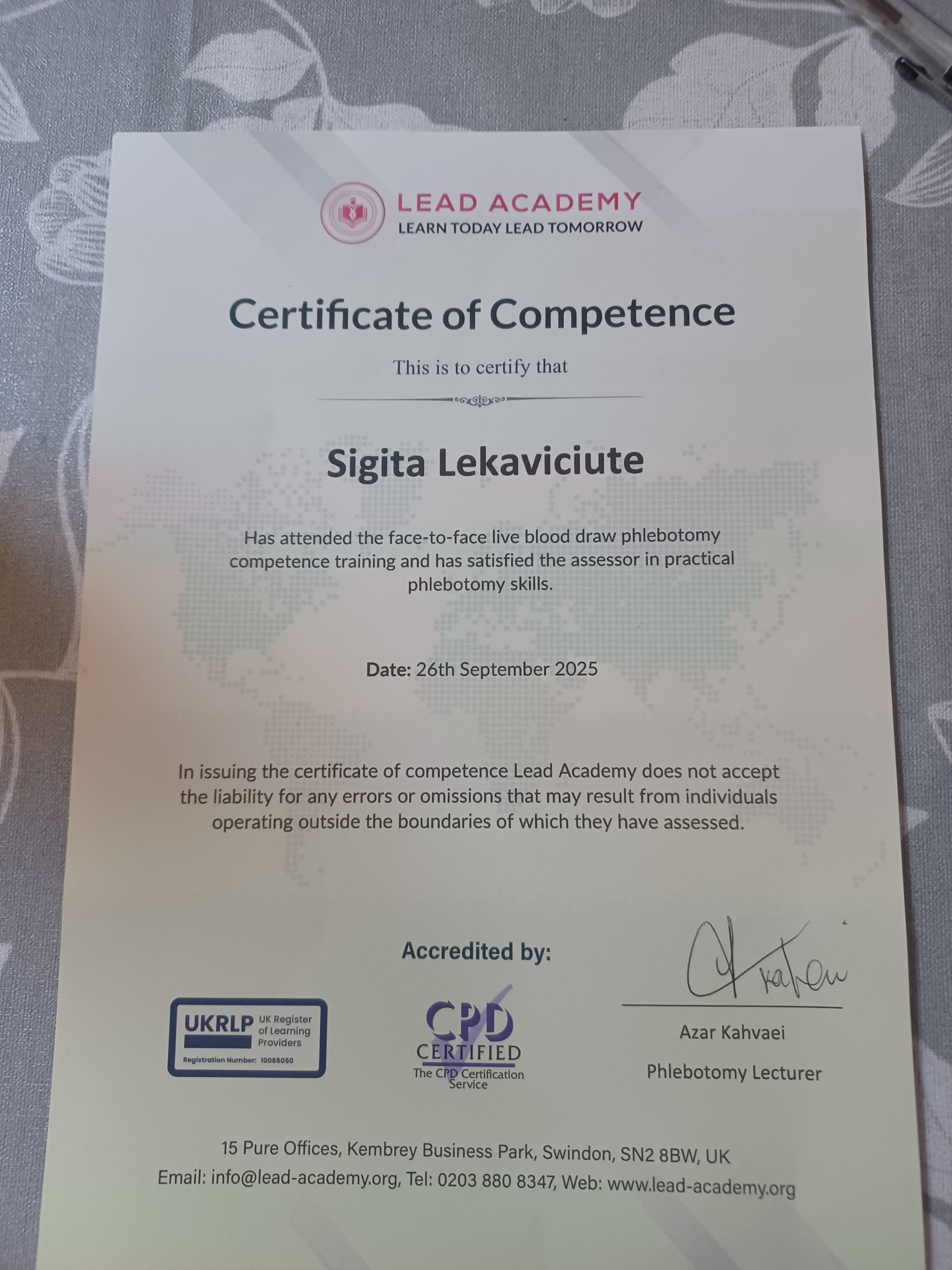| Sigita Lekaviciute | United Kingdom | 6 | Certificate Competence | Certificate Attendance | More... |