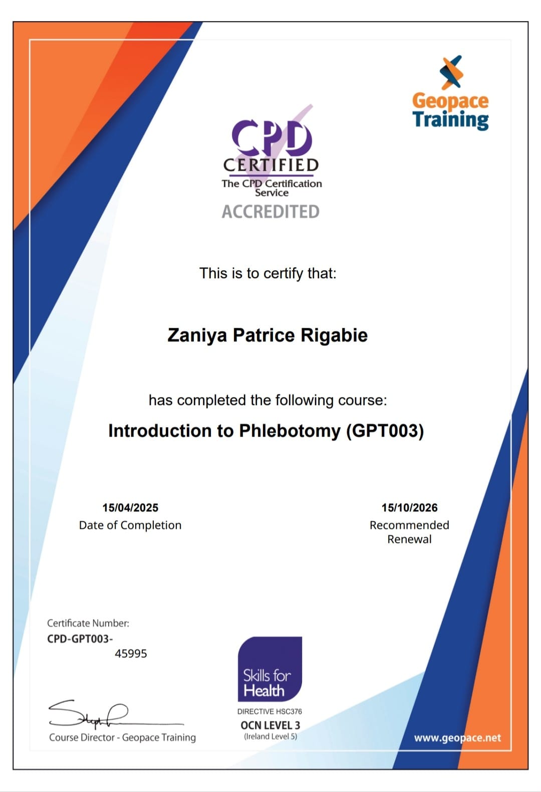 | Zaniya Patrice Rigabie | Essex | 1 | Certificate Competence | Certificate Attendance | More... |